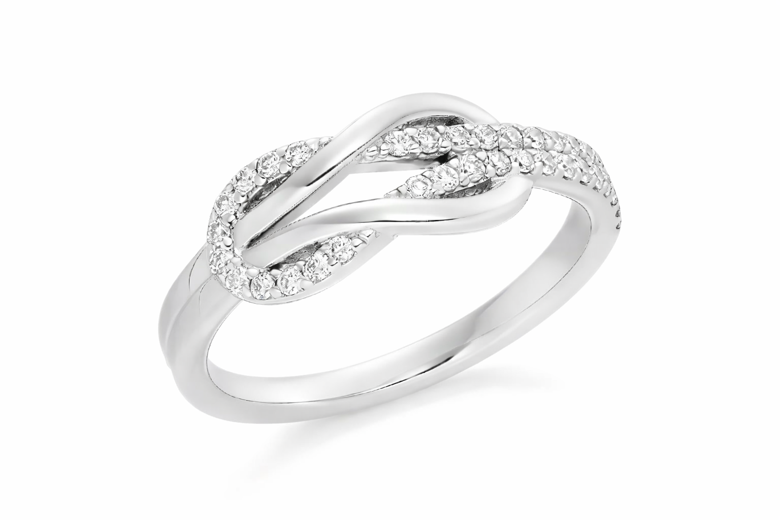Ring Style: Modern, feminine & delicate and designed for everyday sparkle. Its elegant twisted infinity-style band with pavé-set diamonds. Perfect worn alone or stacked with a solitaire in high-polish mirror finish