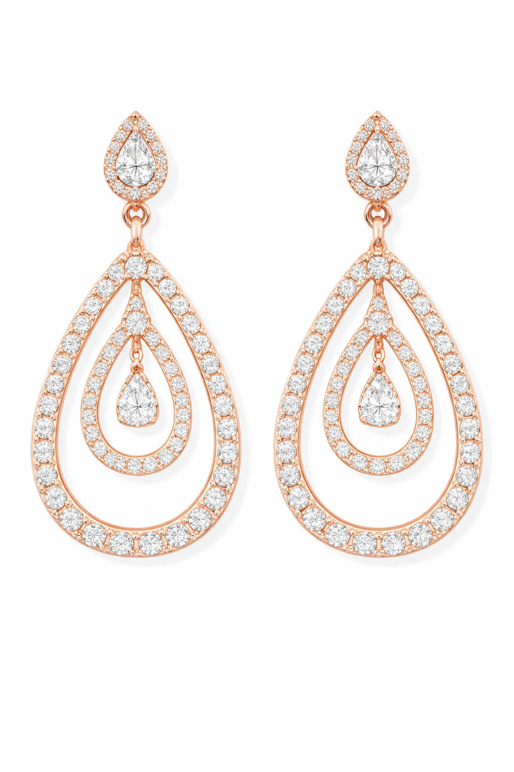 Elegant pear halo stud leading into a fluid teardrop silhouette, fully adorned with pave set diamonds. The design combines delicate detailing with graceful movement, creating a refined yet statement look that balances bridal sophistication with contemporary cocktail appeal.